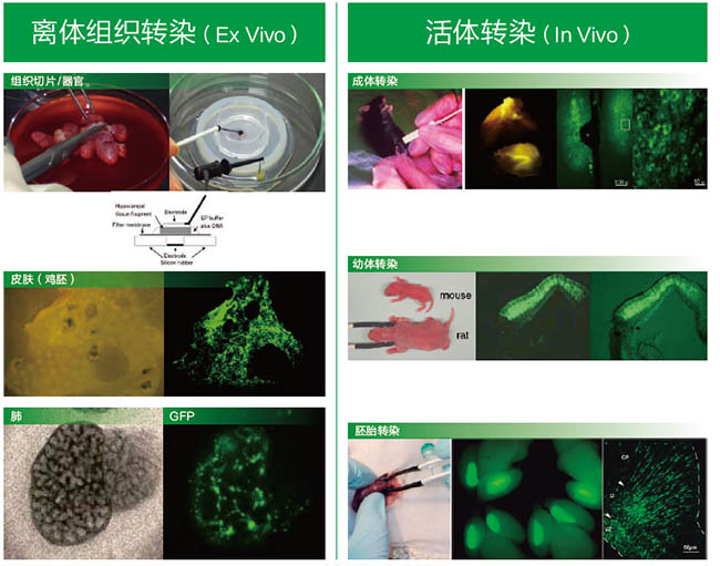 3、活體組織轉染(胚胎、肌肉、皮膚、肝髒、腎髒、肺、睾丸、卵巢(cháo)、腦部、視網膜、角(jiǎo)膜等小鼠(shǔ)、大鼠、斑馬魚、爪蟾(chán)、豬、羊、雞、兔(tù)子、蜜蜂、水蚤、渦蟲、植物種子(zǐ)等)